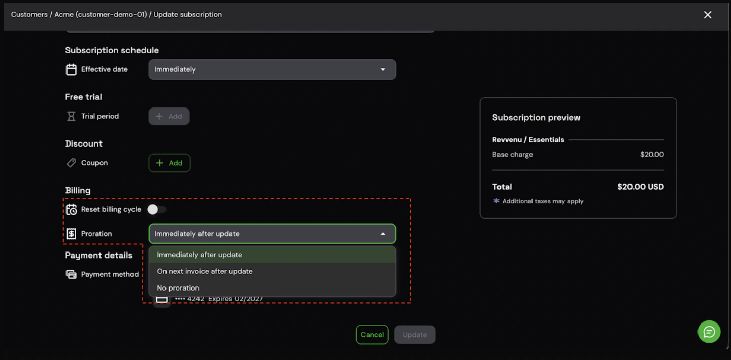 - Proration: choose how to handle the financial impact of the change: